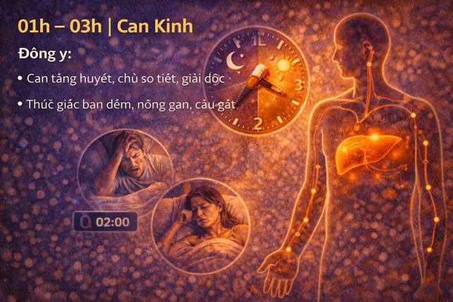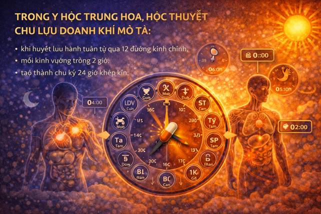 Trong Y học Trung Hoa, học thuyết Chu lưu Doanh khí mô tả: • Khí huyết lưu hành tuần tự qua 12 đường kinh chính, • Mỗi kinh vượng trong 2 giờ, • Tạo thành chu kỳ 24 giờ khép kín. Điều quan trọng là: Đông y không gán giờ cho cơ quan một cách võ đoán, mà dựa trên: • Quan sát triệu chứng xuất hiện theo giờ, • Đáp ứng điều trị theo thời điểm, • Quy luật sinh – khắc – thịnh – suy của khí huyết. Ngày nay, khoa học hiện đại gọi hiện tượng này là nhịp sinh học cơ quan.