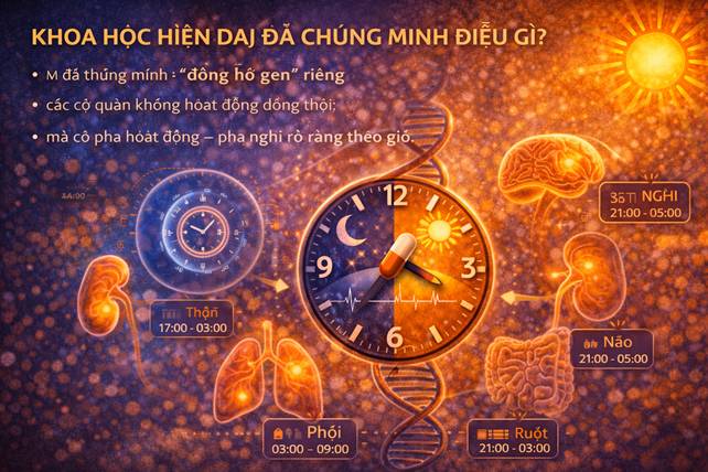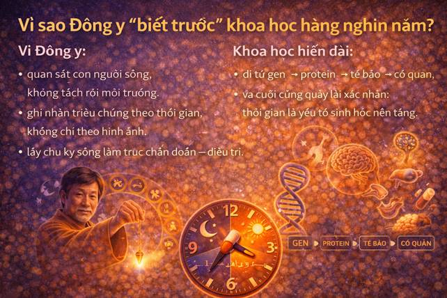 Vì Đông y: • Quan sát con người sống, không tách rời môi trường, • Ghi nhận triệu chứng theo thời gian, không chỉ theo hình ảnh, • Lấy chu kỳ sống làm trục chẩn đoán – điều trị. Khoa học hiện đại: • Đi từ gen → protein → tế bào → cơ quan, • Và cuối cùng quay lại xác nhận: thời gian là yếu tố sinh học nền tảng.
