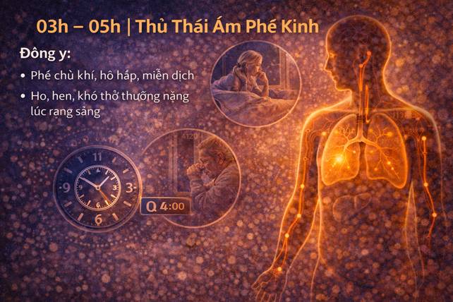 03h – 05h | Thủ Thái Âm Phế Kinh Đông y: • Phế chủ khí, hô hấp, miễn dịch • Ho, hen, khó thở thường nặng lúc rạng sáng Khoa học hiện đại: • Cortsiol tăng nhanh trước khi thức dậy • Đường thở co thắt mạnh hơn ban đêm • Hen suyễn và COPD nặng nhất khoảng 2–4h sáng Hoàn toàn phù hợp