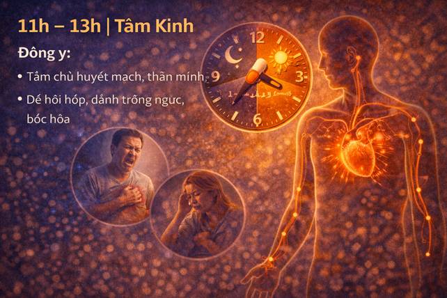 11h – 13h | Tâm Kinh Đông y: • Tâm chủ huyết mạch, thần minh • Dễ hồi hộp, đánh trống ngực, bốc hỏa Khoa học: • Nhịp tim và huyết áp tăng cao ban ngày • Biến cố tim mạch tăng rõ vào cuối buổi sáng Trùng khớp pha hoạt động tim mạch
