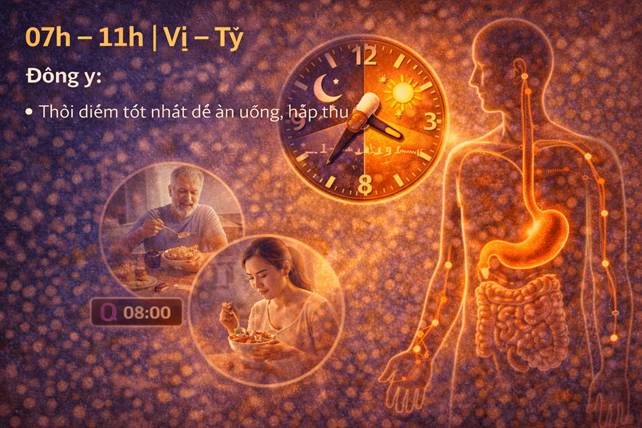 Đông y: • Can tàng huyết, chủ sơ tiết, giải độc • Thức giấc ban đêm, nóng gan, cáu gắt Khoa học: • Gan tăng mạnh hoạt động enzym giải độc pha II • Melatonin thấp – chuyển hóa hoạt động mạnh • Người bệnh gan dễ thức giấc giờ này Đúng pha tái tạo – giải độc gan 07h – 11h | Vị – Tỳ Đông y: • Thời điểm tốt nhất để ăn uống, hấp thu Khoa học: • Enzym tiêu hóa, insulin sensitivity cao buổi sáng • Ăn sáng đầy đủ → kiểm soát cân nặng tốt hơn Cơ sở sinh học vững chắc