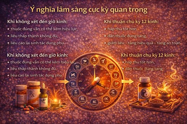 Khi không xét đến giờ kinh: • Thuốc đúng vẫn có thể kém hiệu lực, • Liều thấp thành không đủ, • Liều cao lại sinh tác dụng phụ. Khi thuận chu kỳ 12 kinh: • Hấp thu tốt hơn, • Dẫn thuốc đúng tạng, • Giảm liều – tăng hiệu quả – tăng an toàn. Đây chính là nền tảng khoa học của: • Liệu pháp theo thời gian, • Dưỡng sinh – ăn uống – ngủ nghỉ đúng giờ, • Và cảm xạ y học cá thể hóa thời điểm can thiệp.