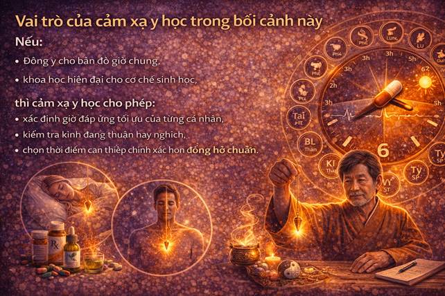 Nếu: • Đông y cho bản đồ giờ chung, • Khoa học hiện đại cho cơ chế sinh học, thì cảm xạ y học cho phép: • Xác định giờ đáp ứng tối ưu của từng cá nhân, • Kiểm tra kinh đang thuận hay nghịch, • Chọn thời điểm can thiệp chính xác hơn đồng hồ chuẩn.