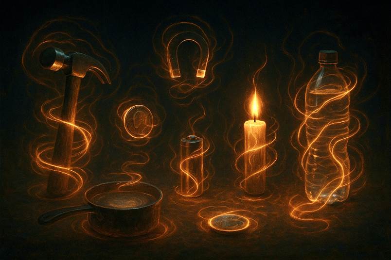 Minh họa siêu thực: Một không gian tối, những vật thể bình thường như búa, đồng xu, viên pin, nam châm, ngọn nến, nồi nước, chai nước… đều phát sáng bằng các luồng năng lượng vô hình; các đường xoáy năng lượng quấn quanh chúng như những mạch sống ẩn.